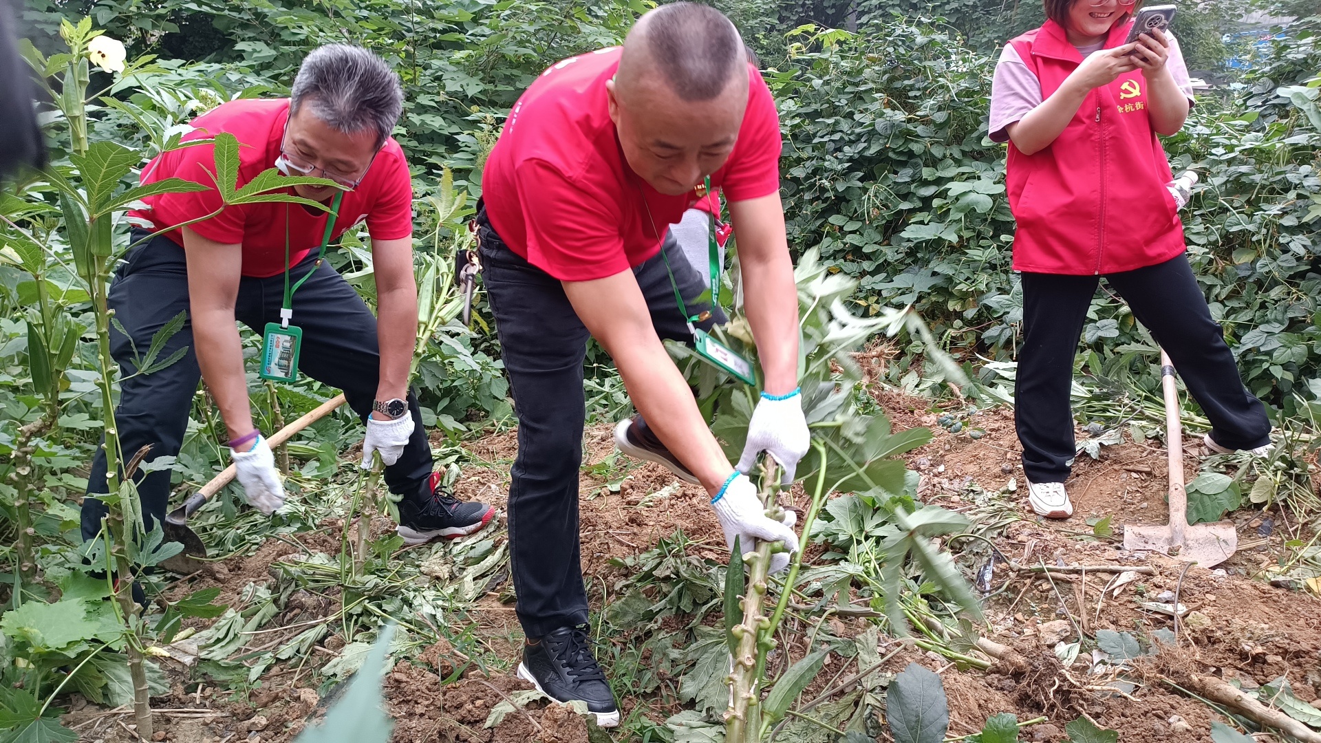 為祖國母親慶生之后,宇諾科技黨員服務(wù)隊前往庭院進(jìn)行勞作。隊員們拿起鐵鍬,幫助清理菜園子,將枯死的秸桿鏟除清到外面。